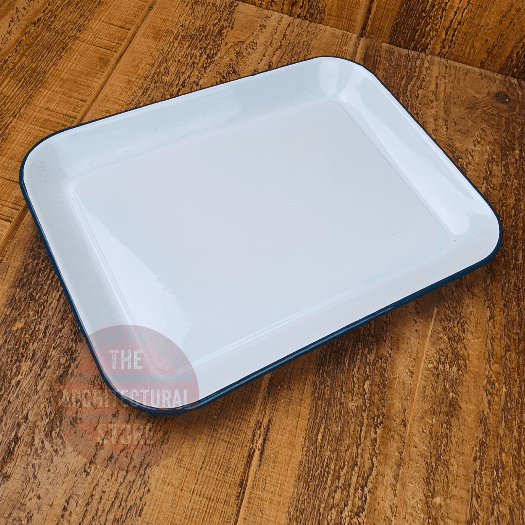 Home / Homewares / Kitchen Accessories / Enamelware / Rectangle Enamel Baking Tray Rectangle Enamel Baking Tray £16.00 Colour: Blue Teal Add to your Wish List Description Rectangle Enamel Baking Tray Dimensions: H3 x W34 x D26cm Hand Wash Only Oven Safe 2 Colour Options